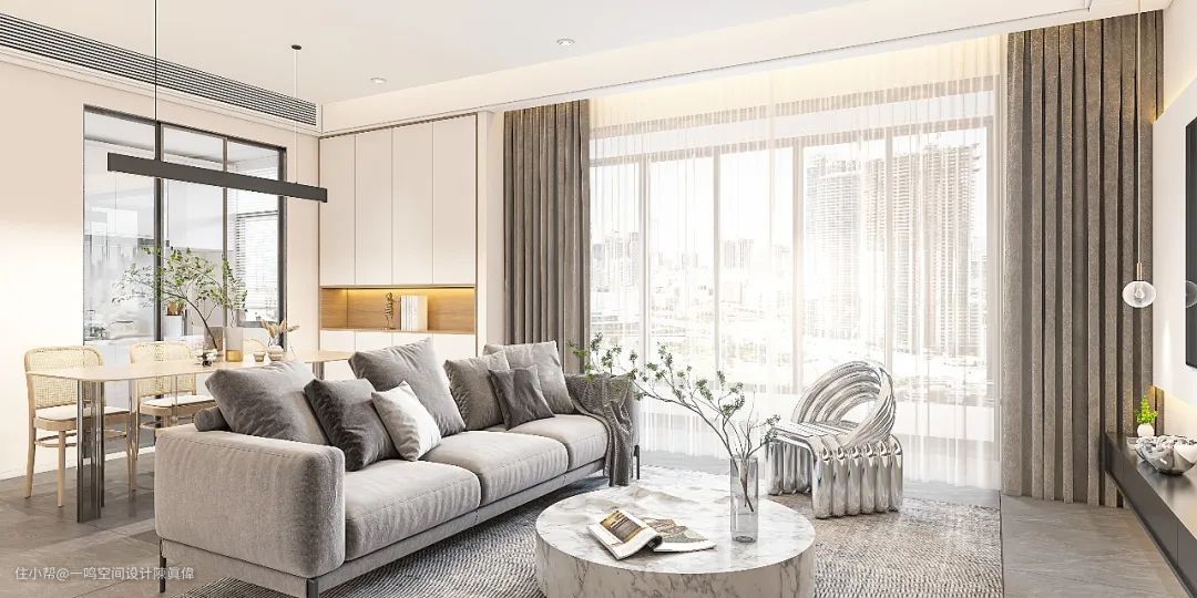 ②在不同的时间点,同一组家具可以有不同的使用方式。比如说一个横厅设计的小户型空间里,以沙发作为软隔断隔开的餐厅空间,在吃饭的时候可以做餐桌;有客人来时,可以用来会客喝茶;工作很忙的时候也是很好的办公桌。