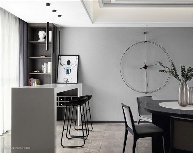在餐厅的后方还打造了一处吧台,沿着墙面向外采用大理石打造的吧台台面同样是简约质感。