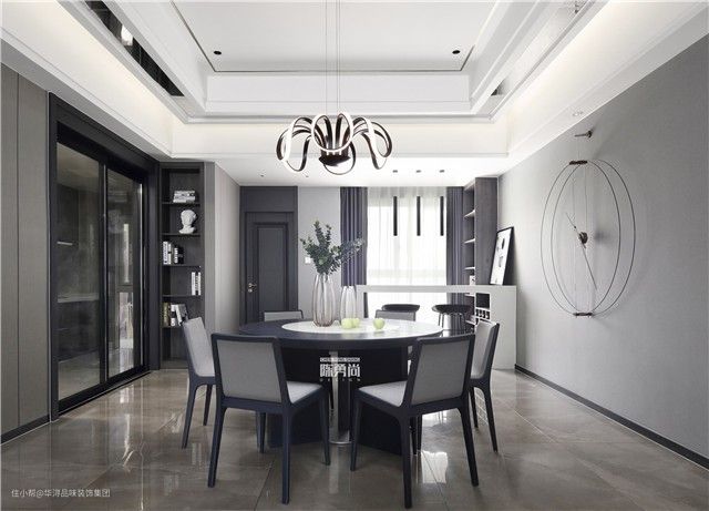 一款黑白配色的主灯在中间耀耀生辉,那动感的造型仿佛是将要一泻千里的瀑布水流,将柔和的灯光洒在餐厅的各个角落。