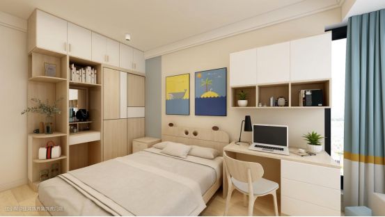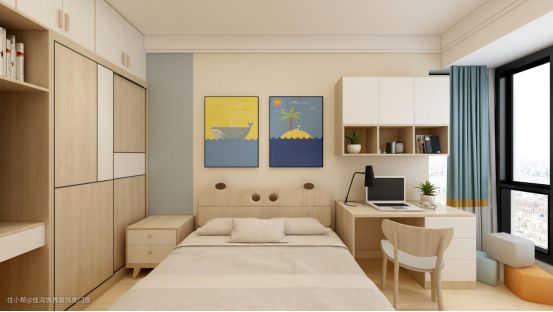 儿童房延续了暖色调的家居风格,并融入了男孩子最爱的天蓝色。搭配小动物造型的床头及墙面色彩挂画,让整体空间可爱灵动,定制半开放衣帽柜满足日常收纳。