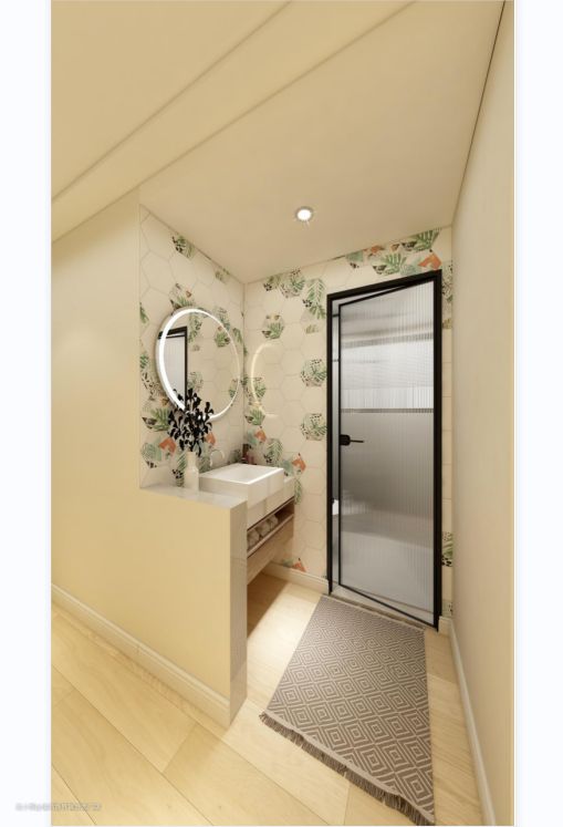 洗漱区外移到过道,采用半墙与过道分隔。暖色调的米色+花纹壁纸打造的洗漱空间,整体色调柔和,充满着夏日的青春气息。