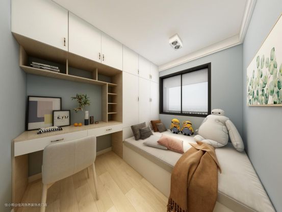 木质书桌椅、堆砌的小方块软垫做成休闲区,方便孩子阅读和休息玩耍。儿童房简化设计,抛去繁复简约干净,让小朋友可以有独处的安静空间。