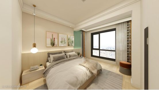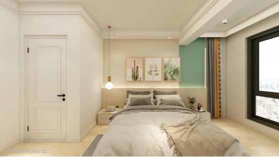 主卧的床头背景延续了客厅的米色和草绿色涂料,结合原木烤漆墙板,再搭配1.8米的大床卧,让空间更加自然简约。