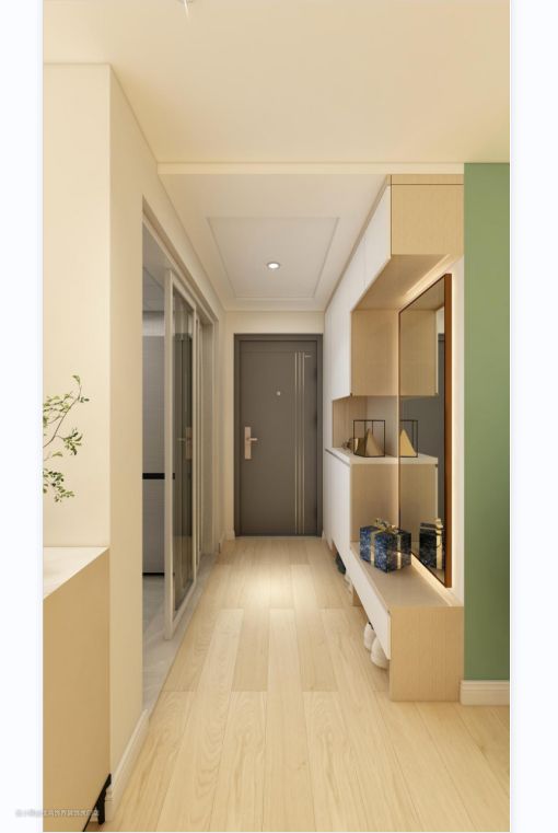 一进门便能感知到家的温暖,配合着柔和的灯光,原木鞋柜中间留空部分呈现出一个凸字形:收纳格、换鞋凳、穿衣镜,恰到好处的布置,颜值高又实用。