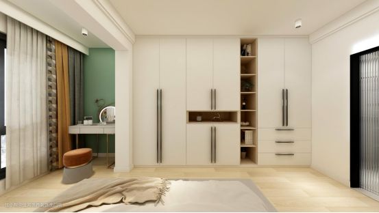 衣帽区并没有浪费掉过道的空间,巧妙融合且梳妆台空间不会被缩小,动线与功能便更为流畅。超大的储物空间和充足的展示柜,把所有的衣服物品安排的明明白白。