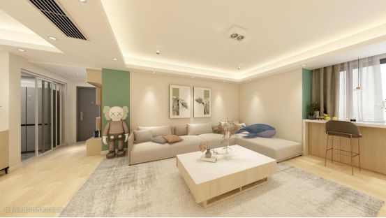 将潮玩Kaws公仔布置在了布艺沙发旁,彰显现代时尚气息,也更贴合屋主的职业属性。