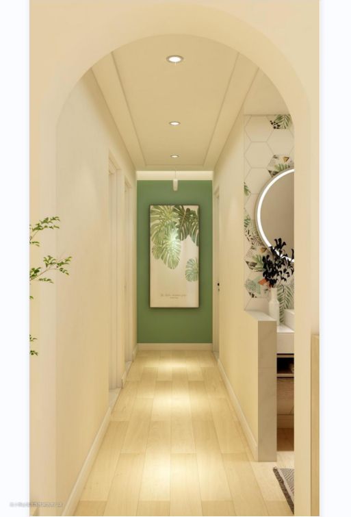 从客餐厅看向过道,通过拱门的互相连通和开放,整体空间更加有趣和谐。一幅芭蕉叶的挂画和嫩绿色的背景让人仿佛置身于热带雨林。