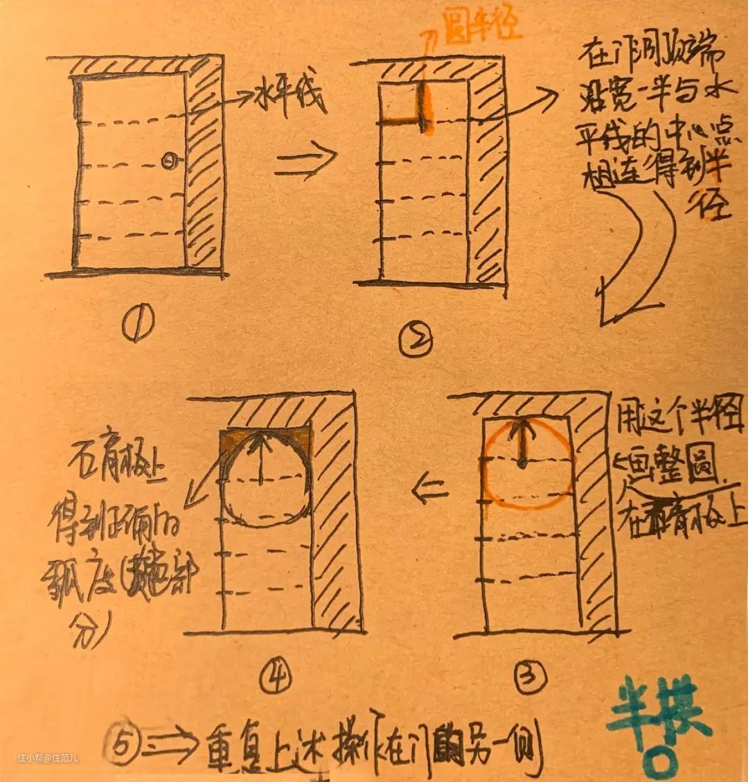 先说半圆拱,有横梁时直接在现有门高上套用,没有横梁时可根据比例向上挖一定高度,记得留白,然后就按照下面这套这套方法论通用。