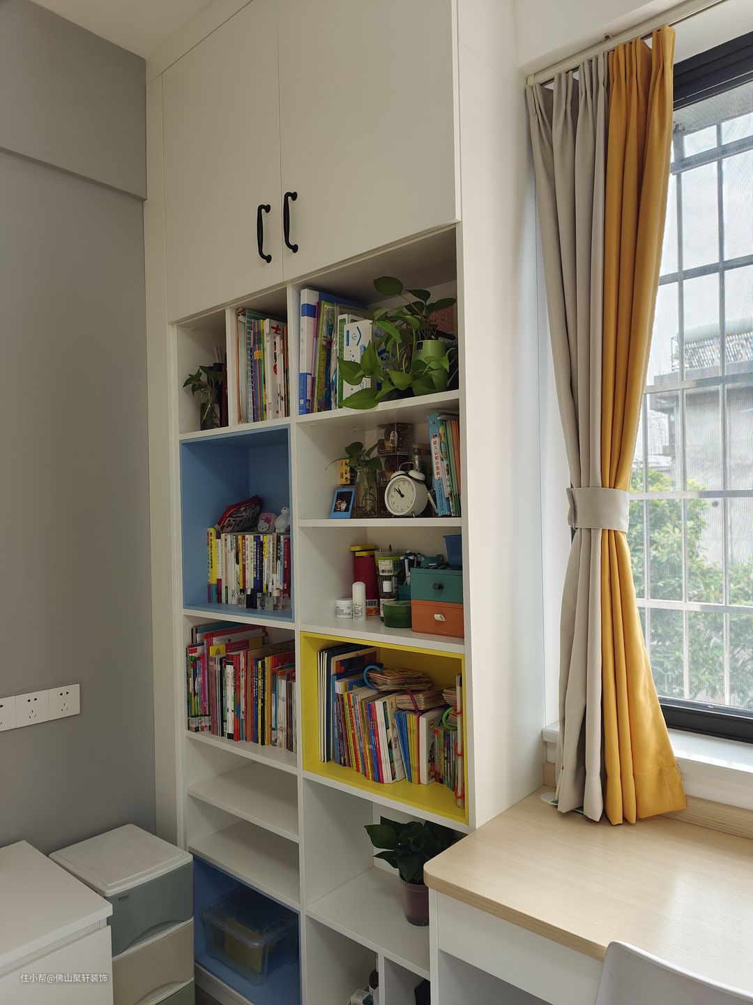 3、床侧边的飘窗也被充分利用了起来,安装整墙书架+靠窗书桌+收纳卡座,类似于书房的感觉。书架上满满的书籍,不难看出屋主他们平时都比较喜欢阅读