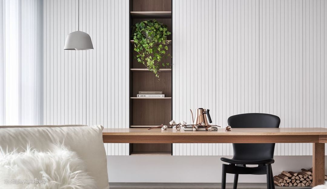 书桌后方的白色悬浮柜体,让柜体的厚重感消弭于白墙中,门片上细腻的垂直线条增加视觉趣味,下方加入些许清水模涂料让空间更柔和。