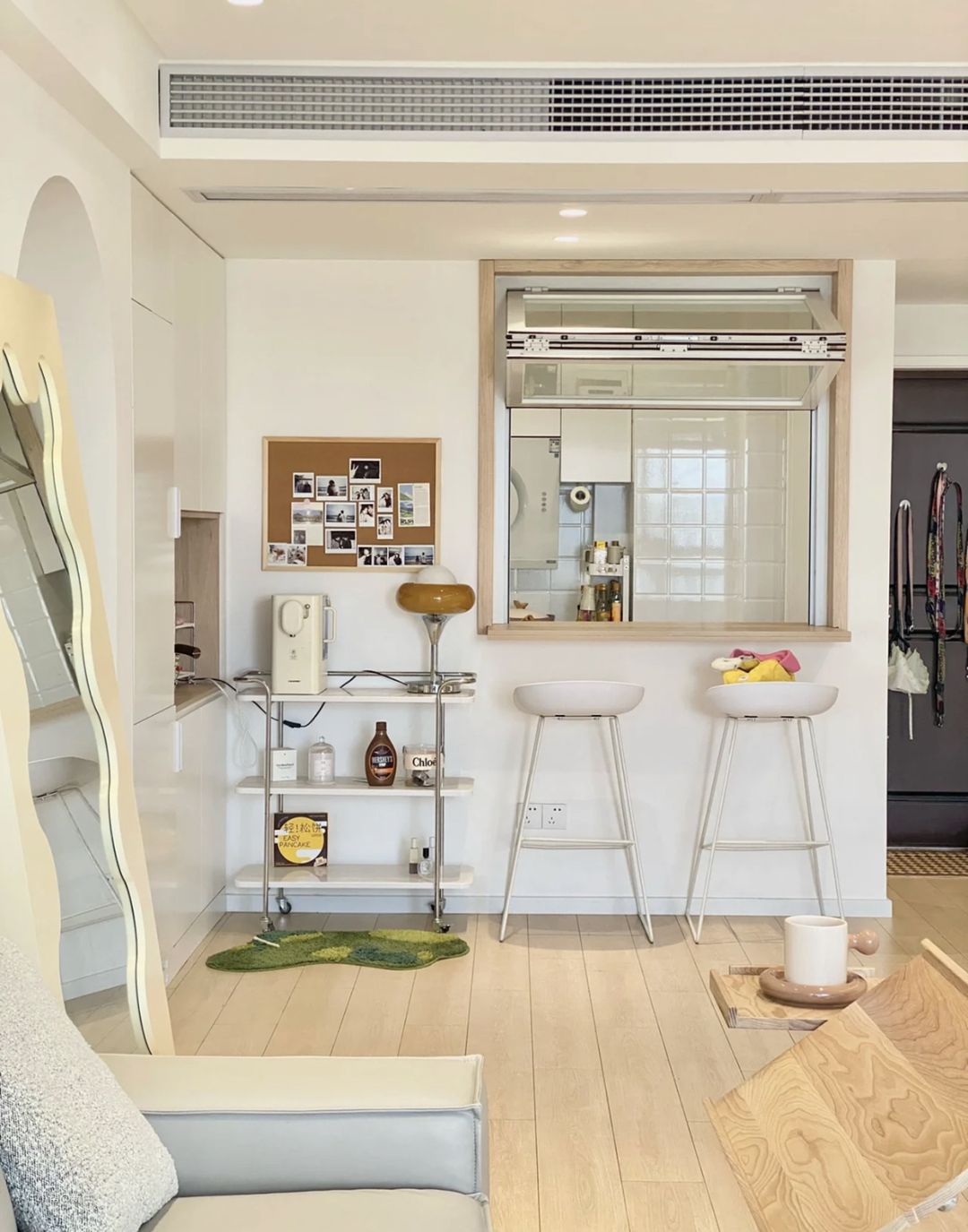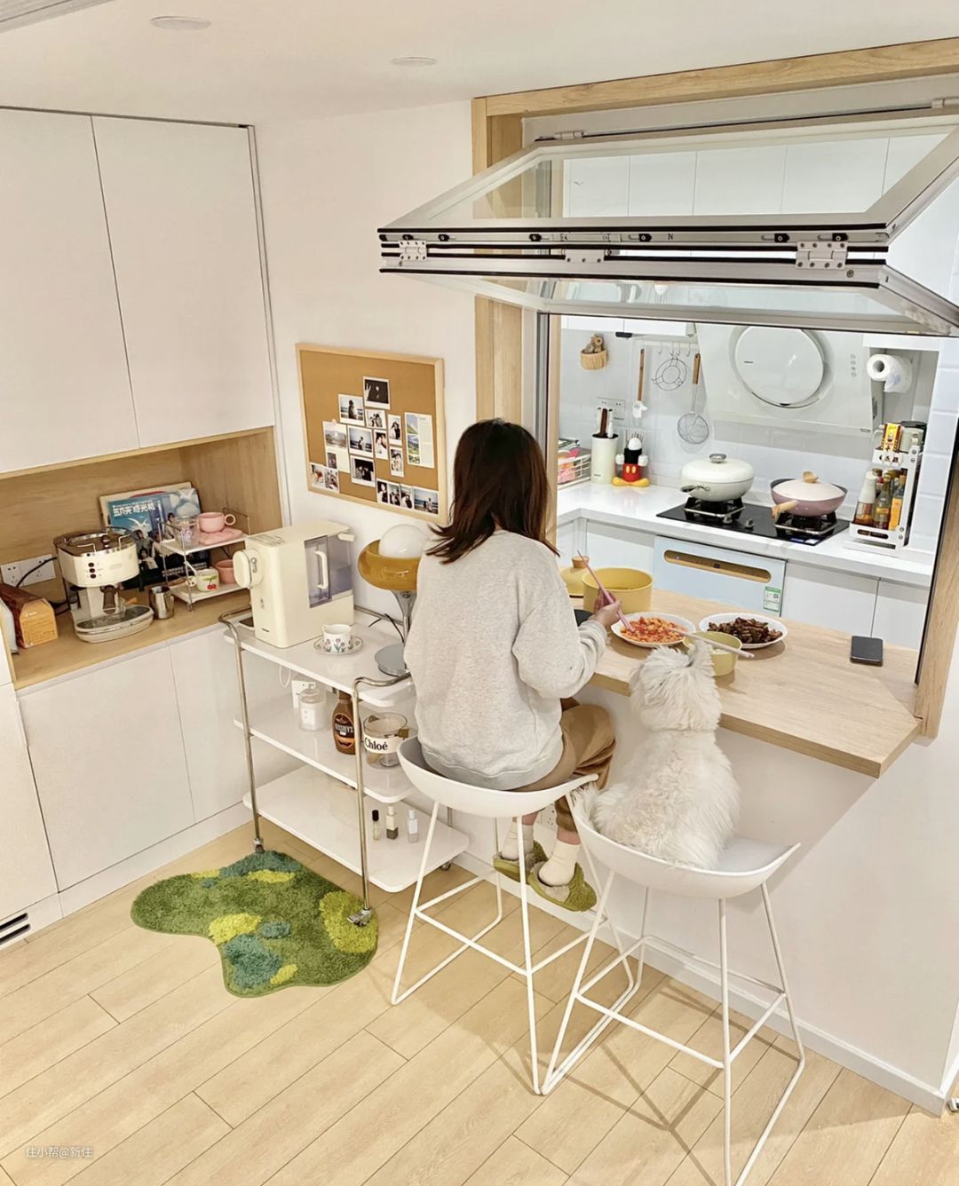 而这位屋主,同样也是采用折叠方式,这次不是门,而是给厨房开了一扇折叠窗,让客厅变成了8米的大空间。
