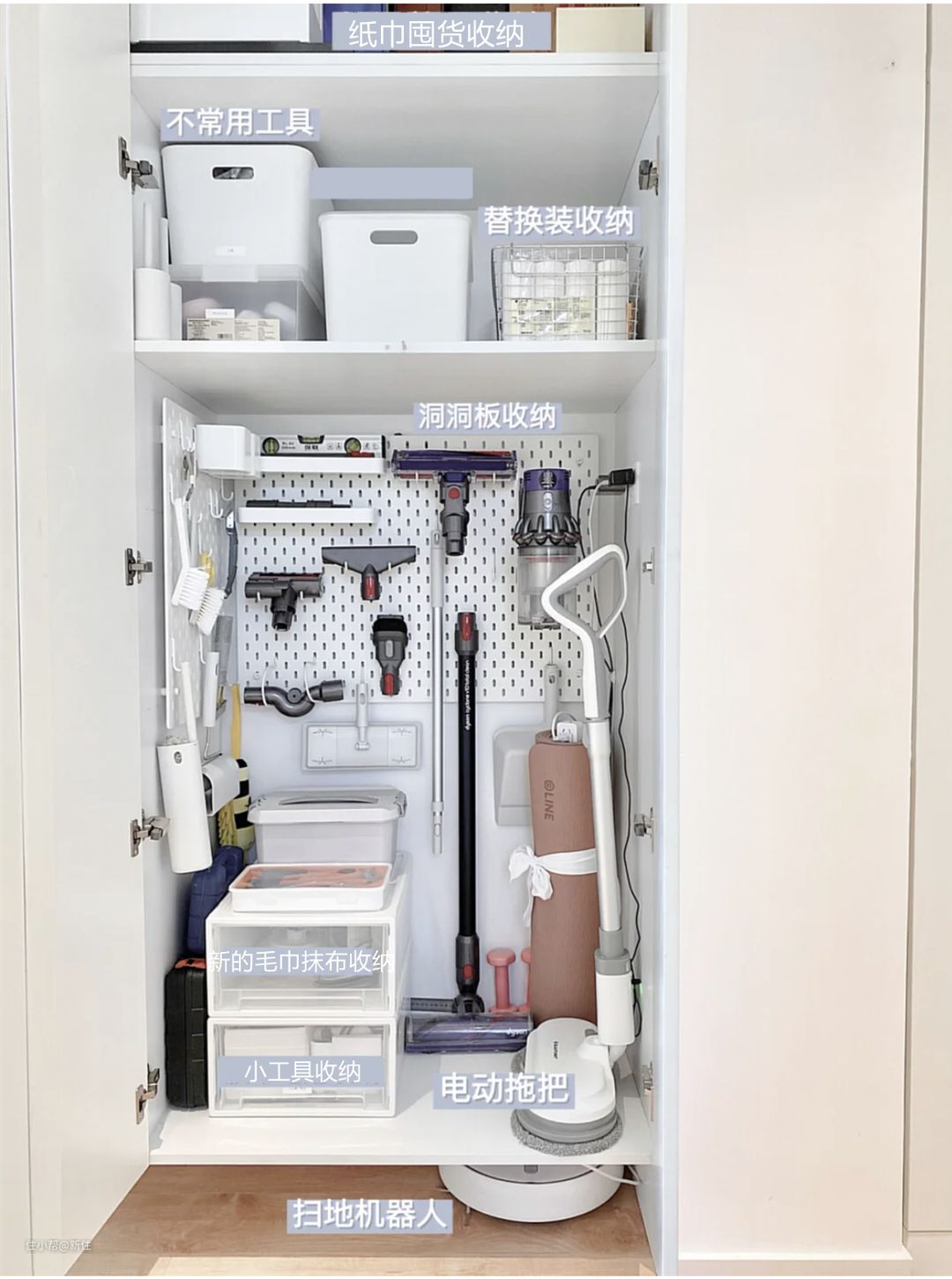 所有清洁工具,利用垂直收纳法,用洞洞板进行收纳,整洁美观。