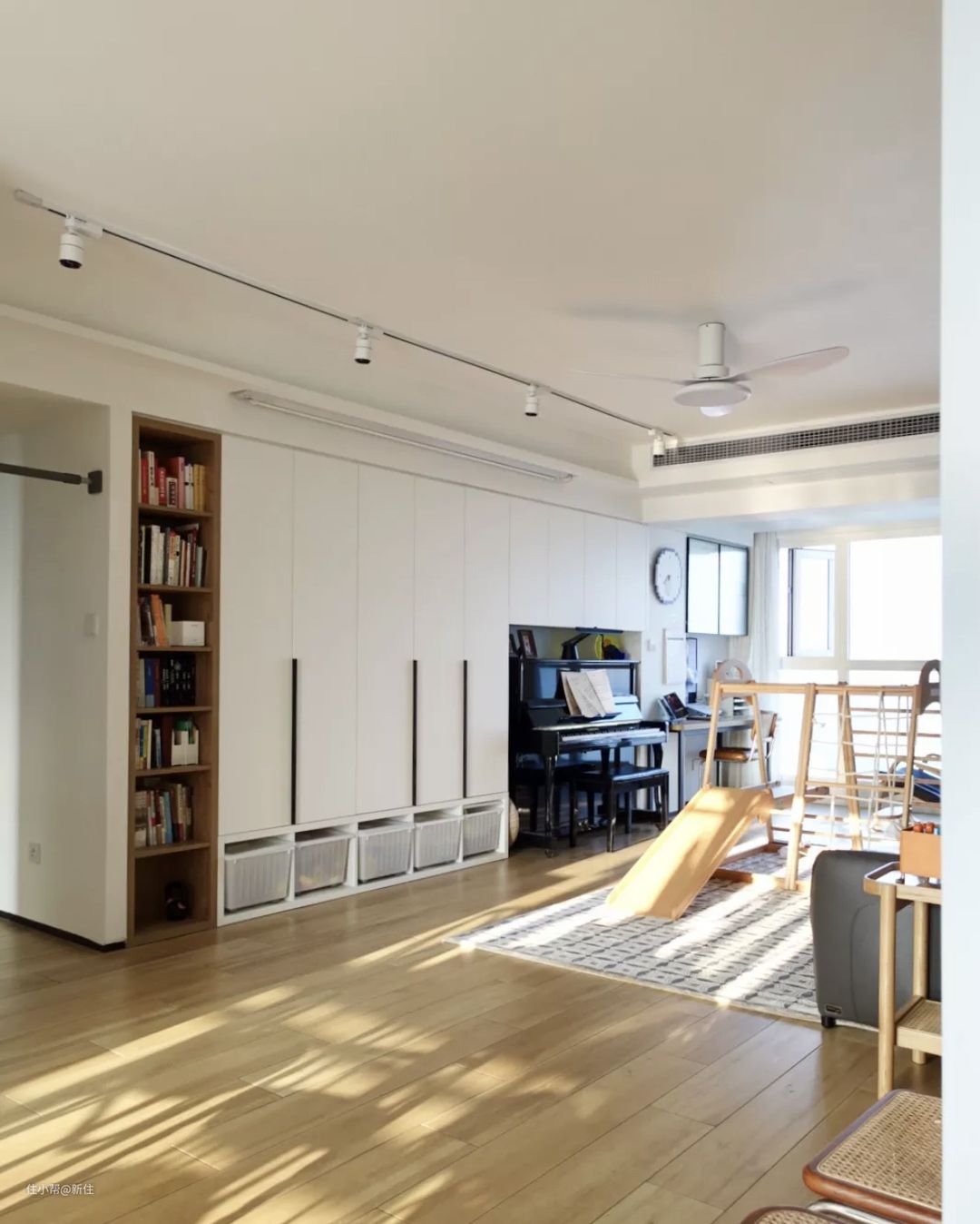 也正是这一整面的收纳柜,容纳了家里所有的杂物,没有额外的柜子,客厅更宽敞,留给孩子更多玩耍、成长的空间。