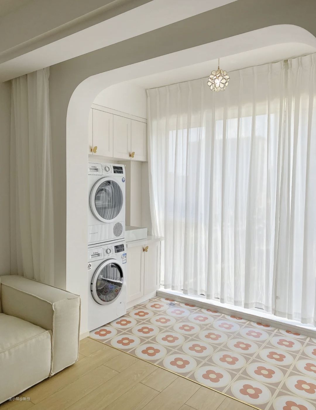 装修小白,没有提前做功课,阳台装了烘干机,但怕临时有衣物晾晒,又装了晾衣架,晾衣架裸露在阳台顶上,窗帘也选了双层,都基本没有用过。