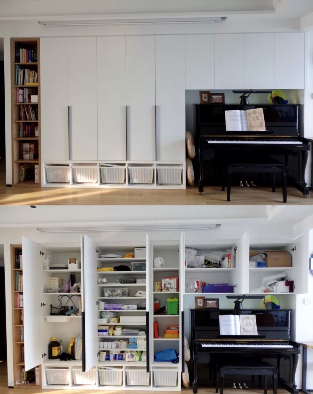因为他家客厅空间有限,又有宝宝大量的玩具需要收纳,自己的钢琴也要考虑进去。