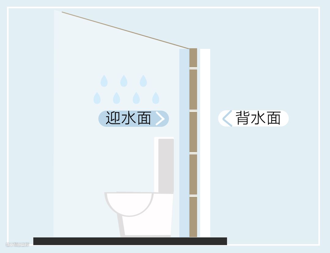拿卫生间和阳台这种长期会跟水气接触的区域来打个比方,卫生间内部或阳台外部墙面是迎水面,而相对的卫生间外墙或者阳台(阳台没封闭的话,外面是会淋雨的)内墙就是背水面。