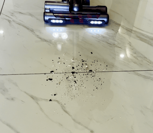 调皮的熊孩子经常边吃边玩,抓着饼干、薯片或面包到处跑,一时忘乎所以、上蹿下跳,客厅的地面上遍布残渣碎屑。清理战场时,在瓷砖上使用双滚电动地刷,固体碎屑瞬间全无残留。