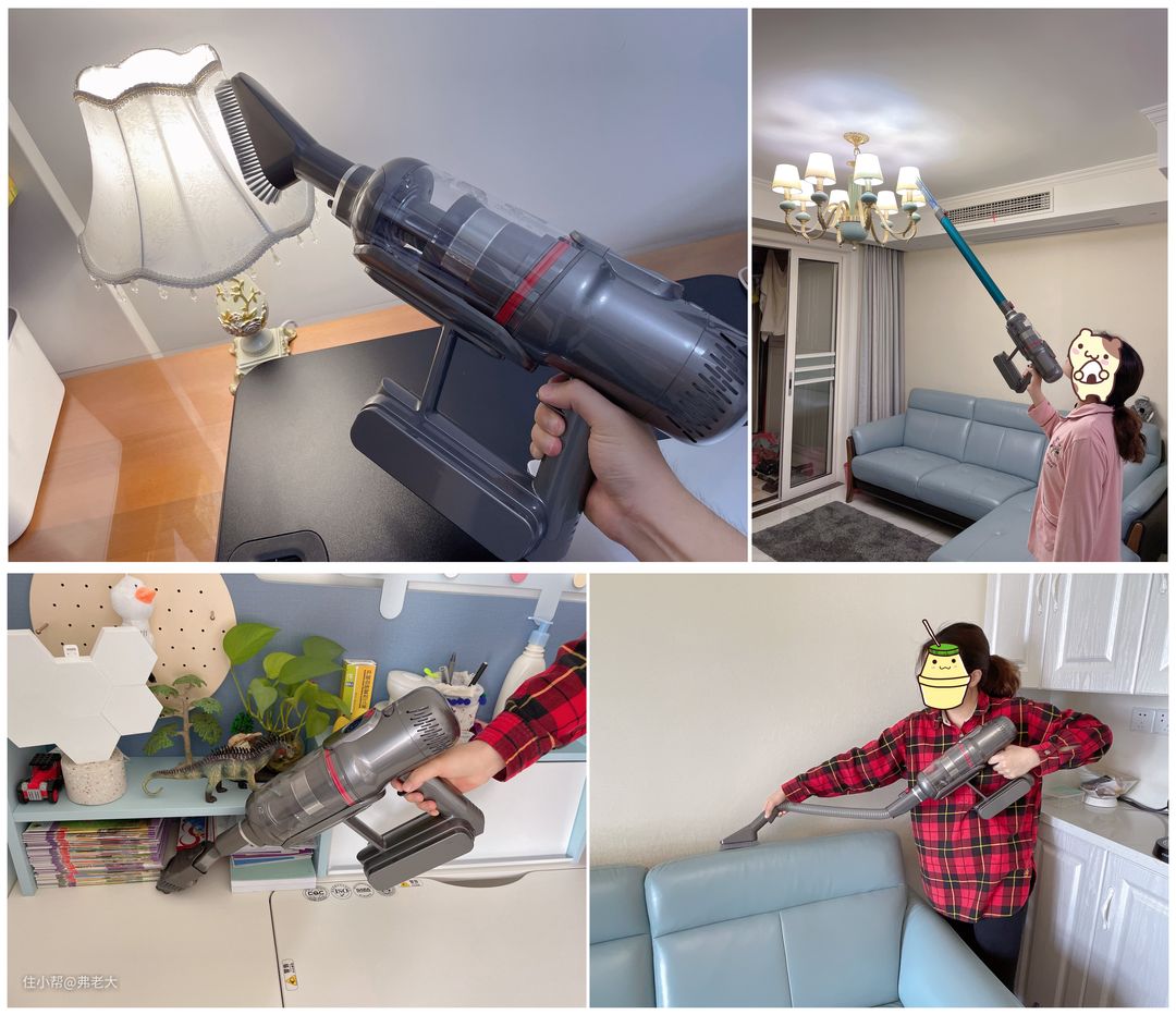 照明长扁吸用于清洁推拉门缝、中央空调出风口;二合一宽嘴刷适用于桌面、台面等;软羽刷用于台灯罩、衣裤等;伸缩软管可用在深抽屉、汽车座椅的清洁。辅助刷头大大拓展了吸尘器对于地面以上空间的清洁能力,让我们对吸尘器的认知从传统的二维地面清洁提升为全屋三维立体清洁!