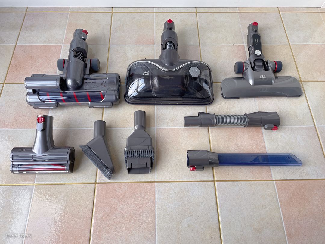 8个刷头由3主刷+5辅刷组成——双滚电动地刷、旋转擦地刷、超薄地刷用于应对不同类型地面和脏污的清洁,照明长扁吸、二合一宽嘴刷、电动除螨刷、软羽刷和伸缩软管则用于家具、灯饰、角落甚至汽车的多样化场景清洁。
