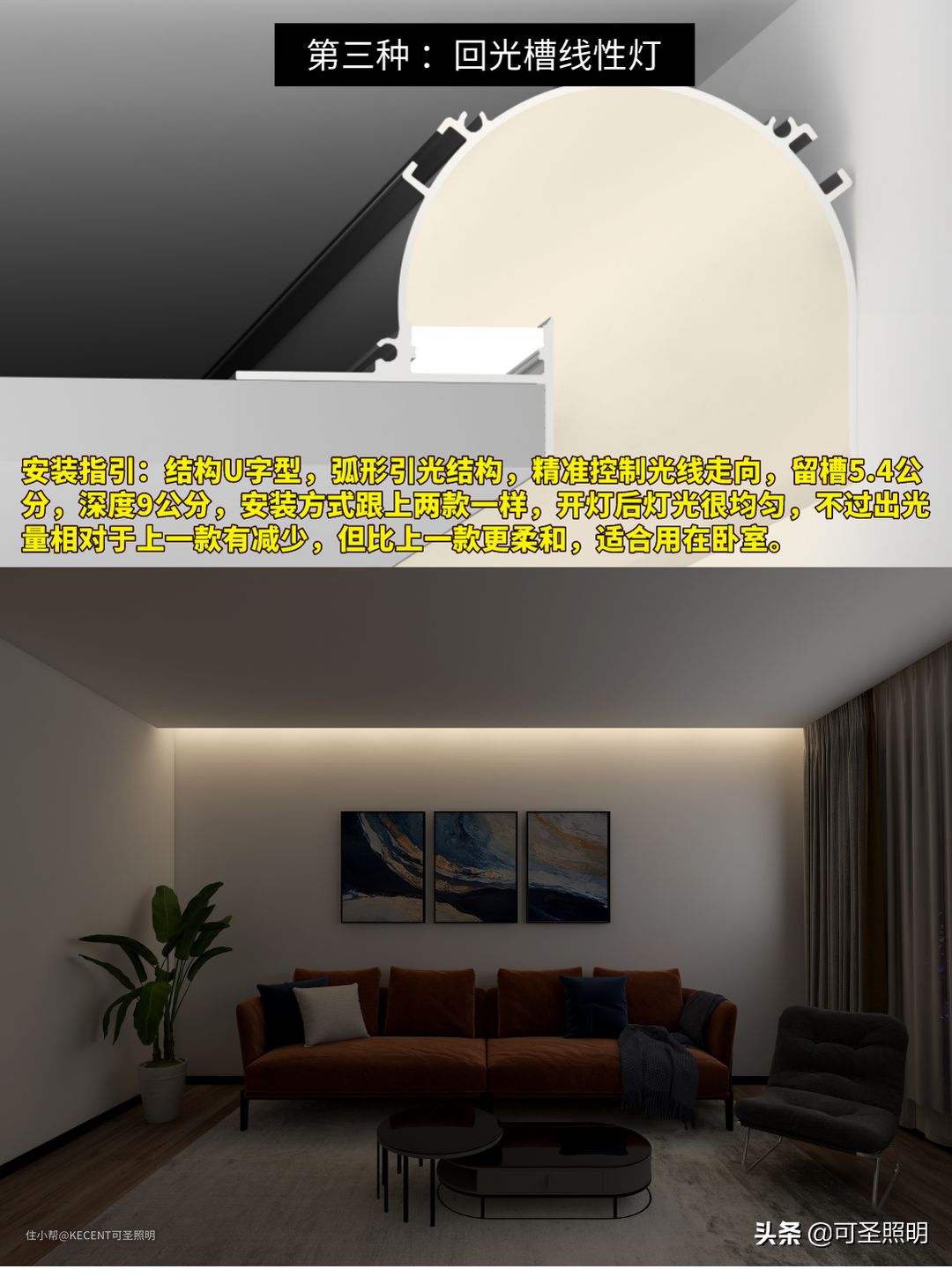 结构像U字型,弧形引光结构,精准控制光线走向,留槽5.4公分,深度9公分,安装方式跟上两款一样,开灯后灯光很均匀,不过出光量相对于上一款有减少,但比上一款更柔和,适合用在卧室。
