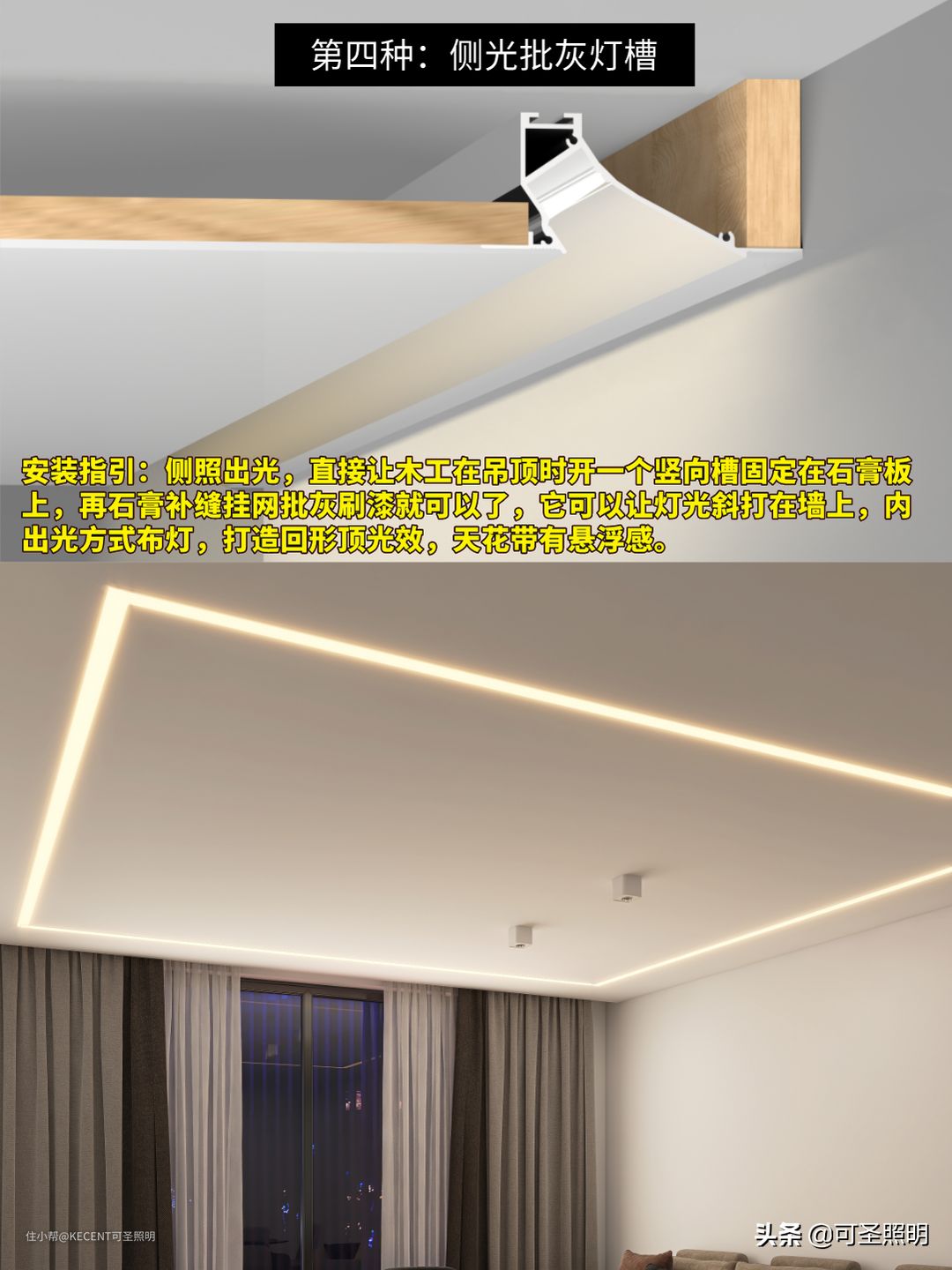 侧照出光,直接让木工在吊顶时开一个竖向槽固定在石膏板上,再石膏补缝挂网批灰刷漆就可以了,它可以让灯光斜打在墙上,内出光方式布灯,打造回形顶光效,天花带有悬浮感。