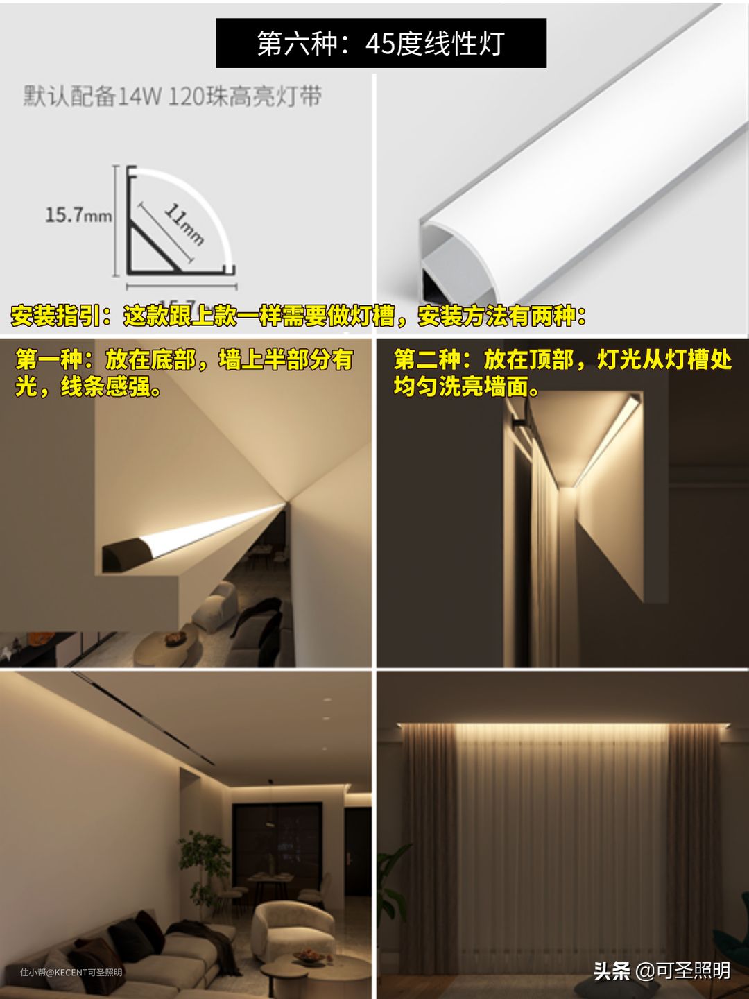 这种形材需要做灯槽,一般层高3米以下,建议槽宽12-15cm,线性灯摆放不同位置效果也会不同,推荐两种做法: