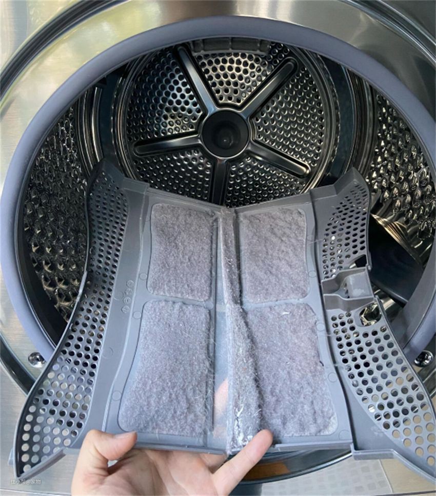 自带绒毛收集器,将衣服上掉落的杂质、绒毛收集起来,便于后期集中清理。我一般每周把收集器中用水冲洗干净,再放回去,确保烘道干净卫生,避免二次污染。