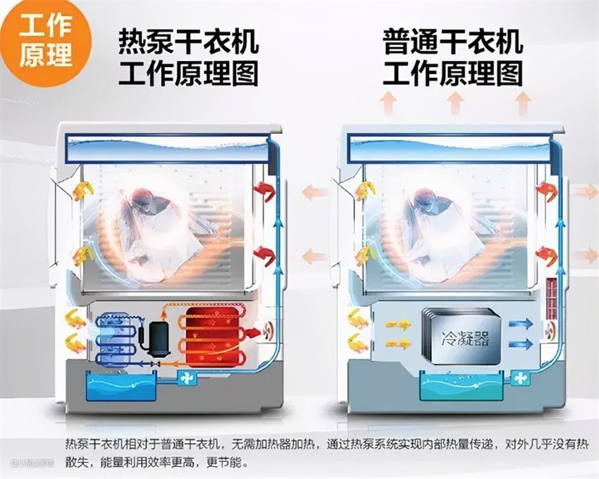 烘干机效果好不好,重点在于烘干方式。市面上常见的烘干机就2种方式:冷凝和热泵。