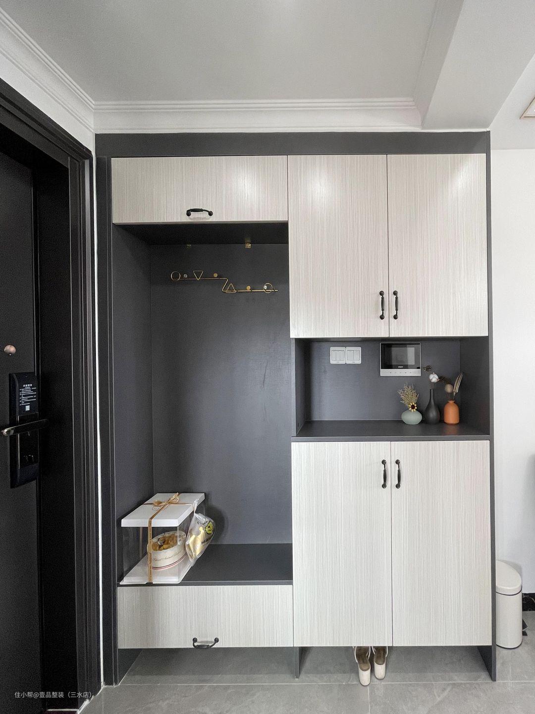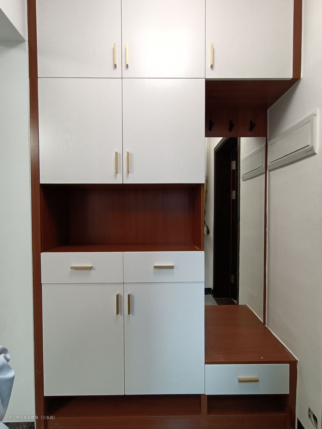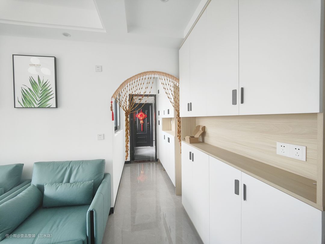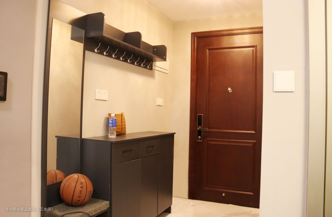 户型小,采光不行直接简单装个矮柜放鞋,上方装挂钩挂包包雨伞之类的,省钱还不占用空间。