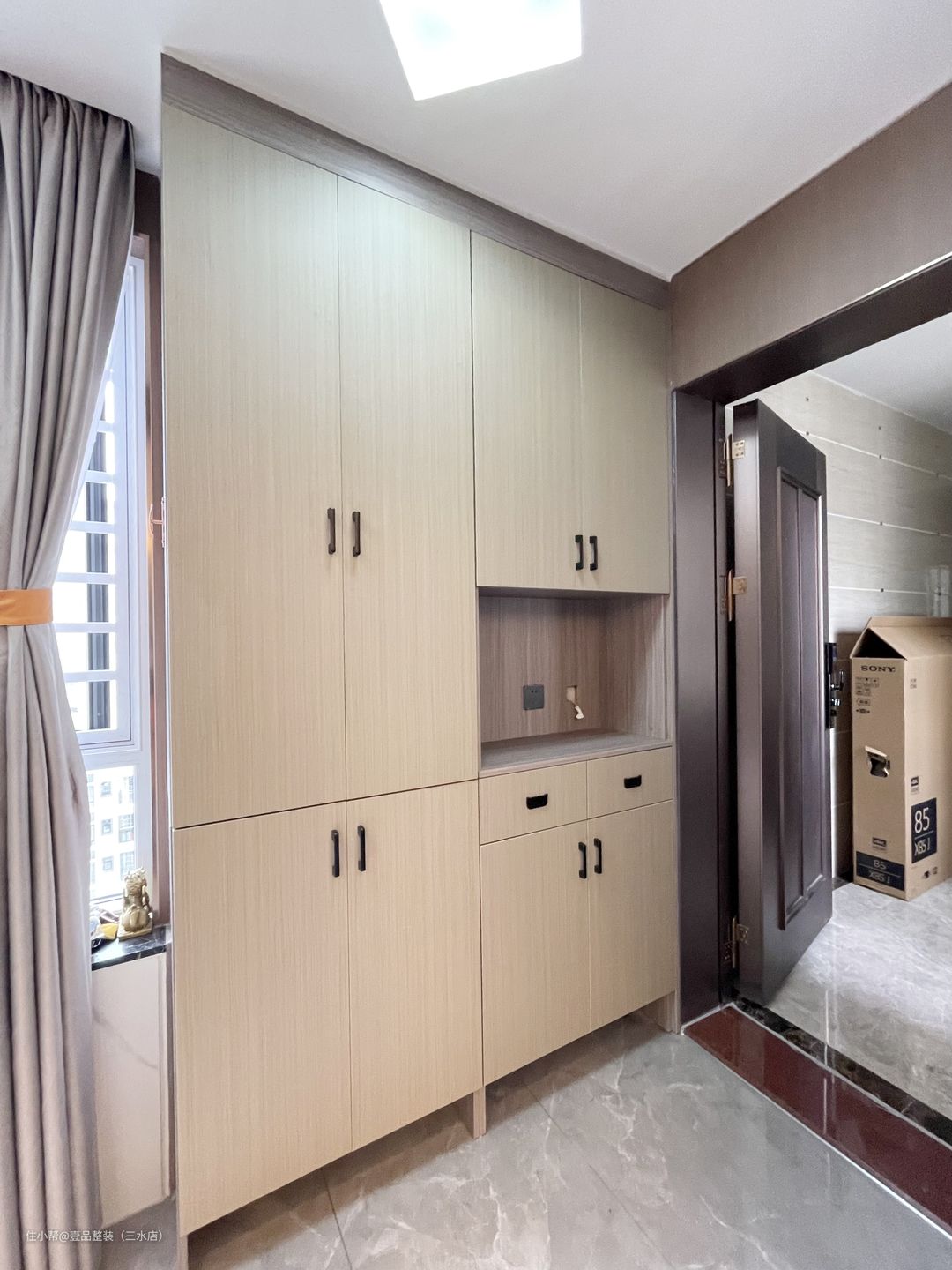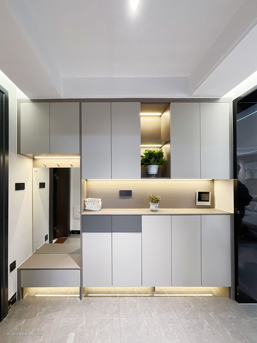 入户玄关道为长廊型的,靠墙整面安装柜子,光线不好的情况下搭配灯带使用,补充光源增添氛围,光线好的情况下做全封闭柜,中间镂空放物,其他柜子可存放鞋子或不常用衣物棉被这些。