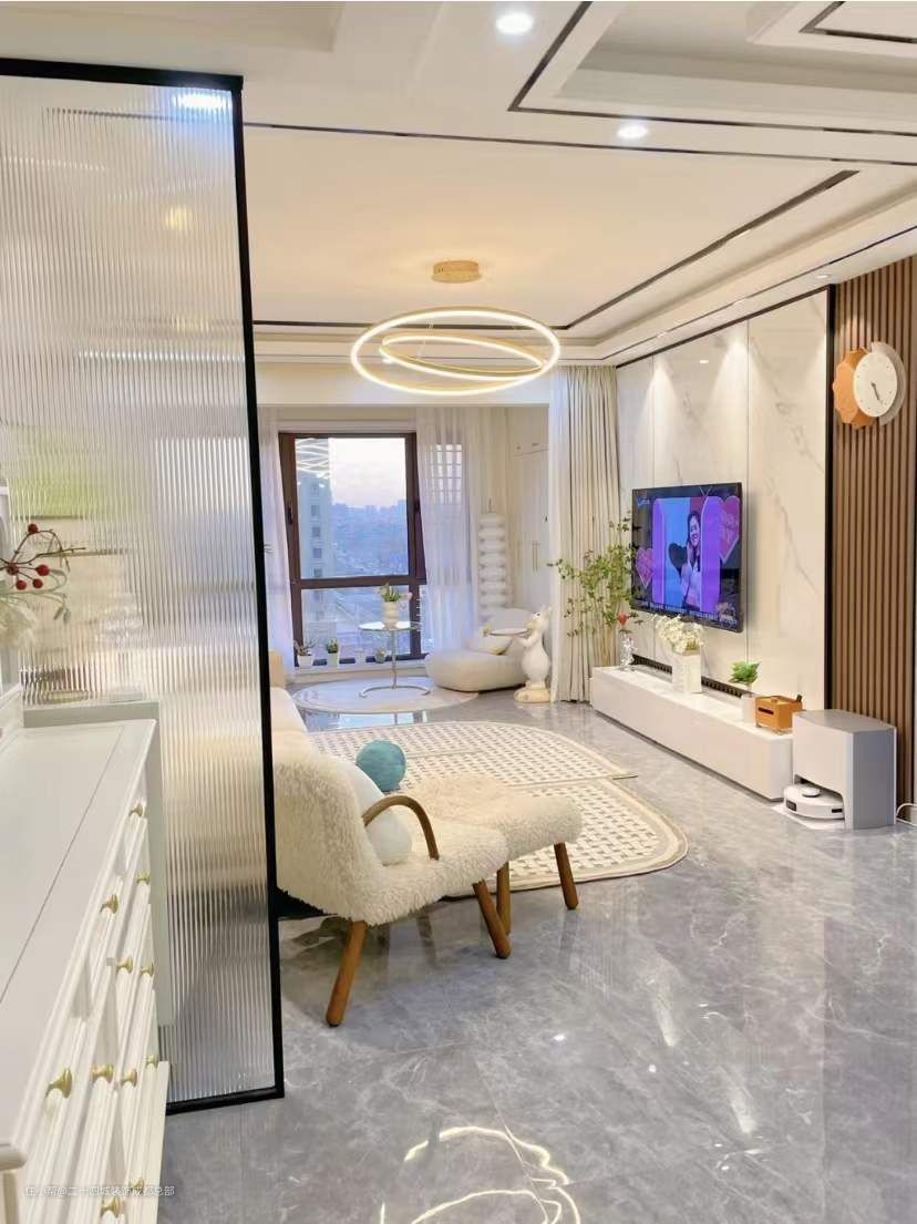 新家的硬装以白色和灰色为主,地面是600*1200的灰色地砖,墙面灰色+米色墙布,吊顶钛金条+石膏板吊顶,电视墙岩板+格栅,整体效果偏冷色系一些。在软装上,就选择了暖色系,带金脚的餐桌,奶油色的沙发……冷暖色结合,布置出了一个精致又高级的家。