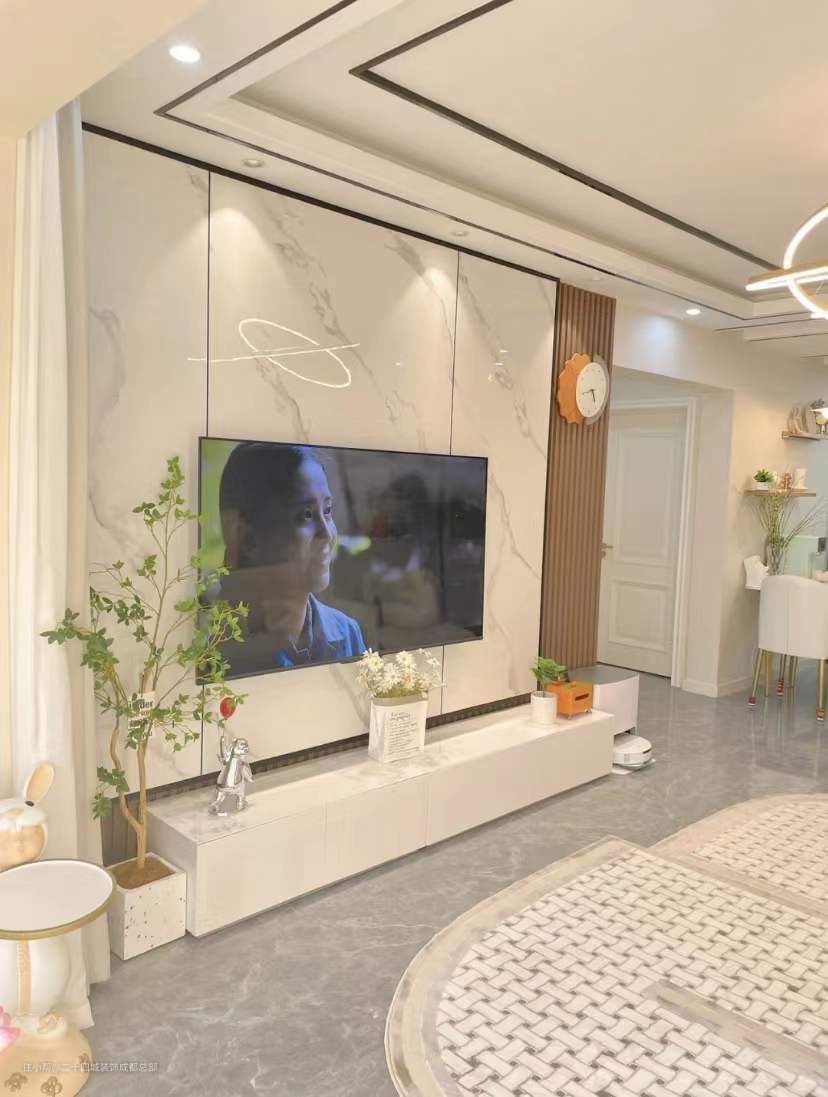电视墙的主体由三块大岩板组成,用和顶面同样的钛金条包边,中间的缝也卡入了钛金条,可以增加岩板的细节感。右侧墙面增加一小块的实木格栅,用材质上的不同,来增加墙面的温馨感。