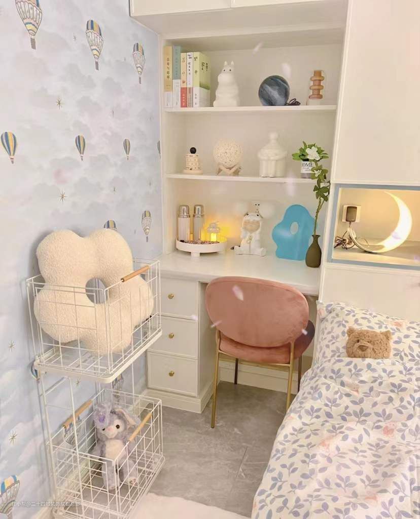 次卧榻榻米,地面灰色地砖,墙面蓝色热气球墙布,天棚双层石膏线,整体分为柜子+床+书桌三部分。
