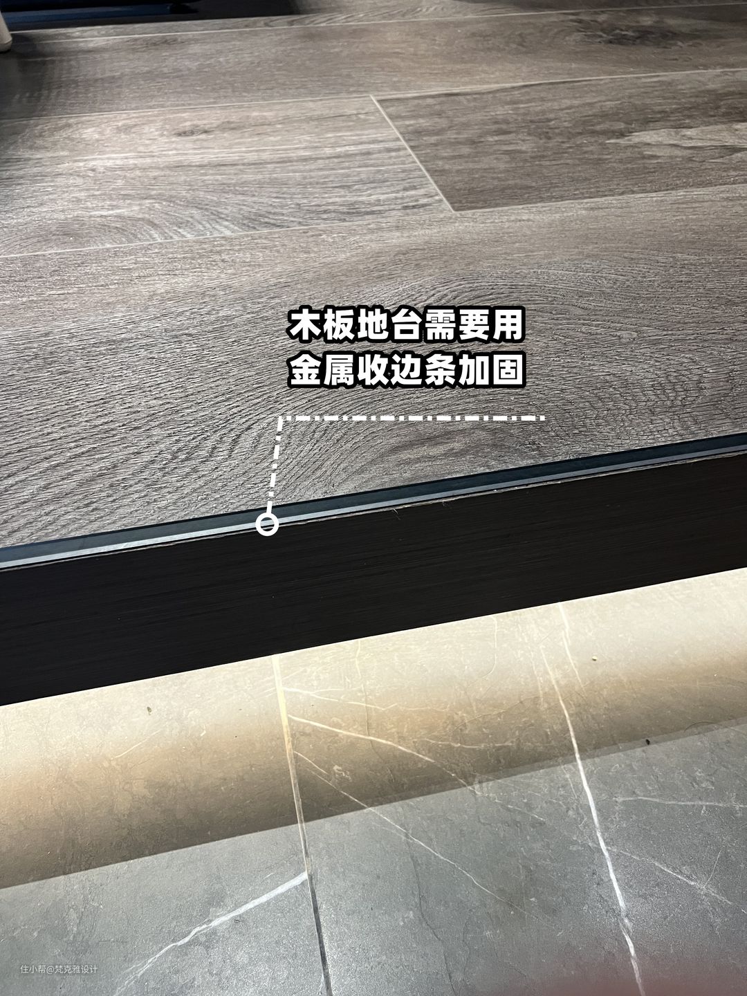 Tips:准备木地板做地台的小伙伴,转角处直接木地板碰角强度不高,后期易损坏,需要用金属收边条加固。