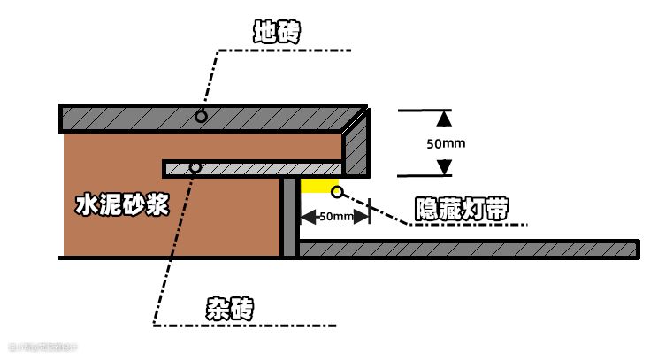 A 先用砖砌出地台,再用瓷砖做出挑空,完成面高度10公分,5公分挑空,5公分侧边。具体结构看剖面图。