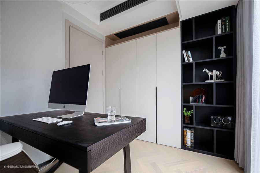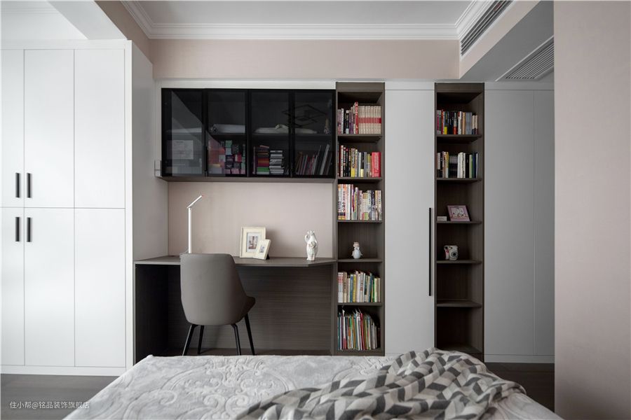 充分利用空间,将书架设计成L形,LED长灯安装在书架底部。当光线打开时,整个书柜看起来更有层次感,整体效果会更高级。