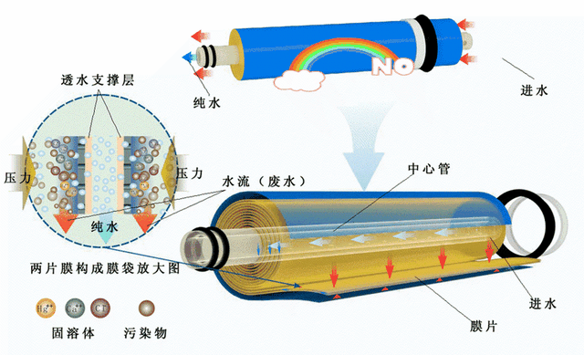 绝大多数净水机都是需要排放废水的,这是因为净水机里的主要滤芯是RO反渗透膜滤芯。这根滤芯的过滤原理是反渗透:
