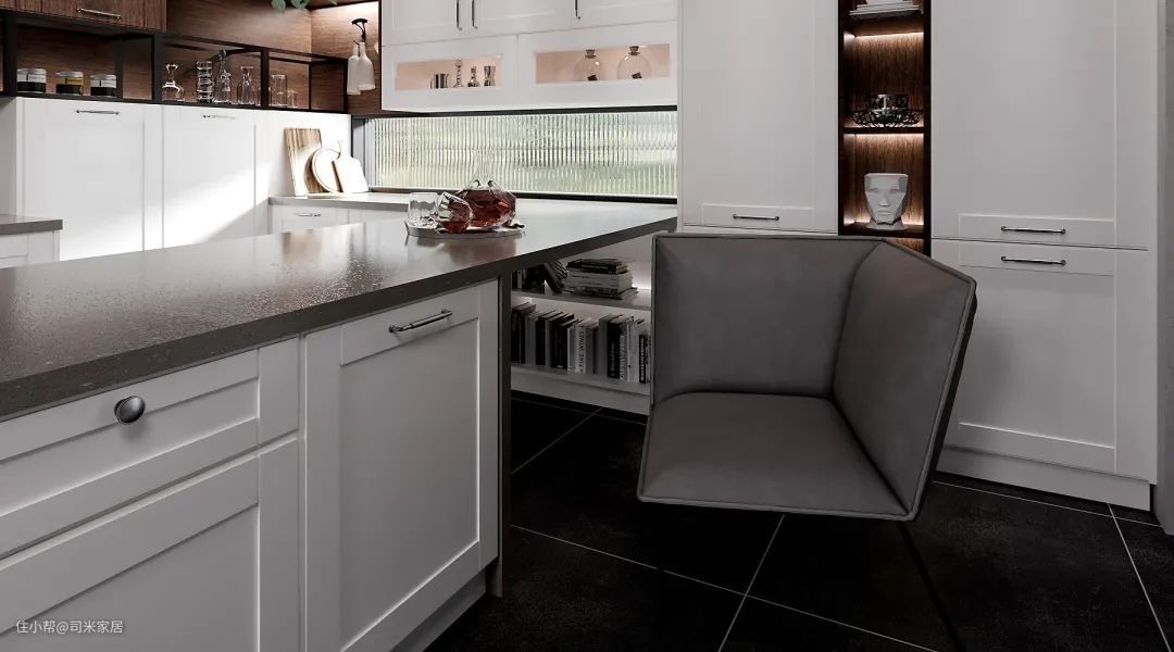 人性化的电器中高柜设计,上方空间可置放小家电,炉台旁设计了延伸台面,用于存放常用的锅碗餐具,增加了台面的操作空间,加上椅子,就是一个放松的小空间。