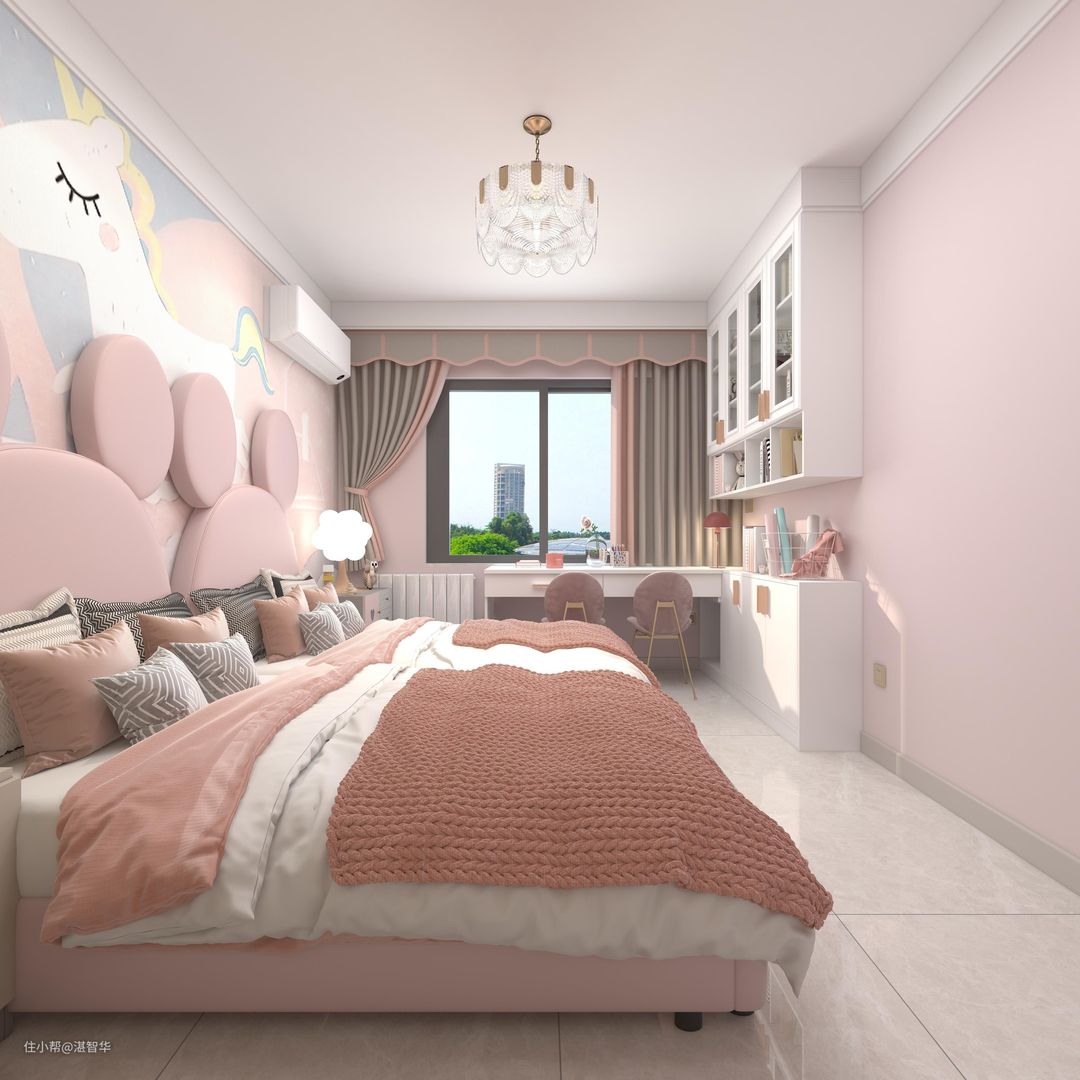 儿童房进门整排大衣柜,搭接床头柜,避免成品床头柜遮挡柜门,两张1.2床挨着摆放,窗下预留出暖气位置,整排搭接大书柜,方便收纳宝宝学习用品,以及地柜可做零食柜。床头背景定制墙布,其他墙面粉色系乳胶漆。