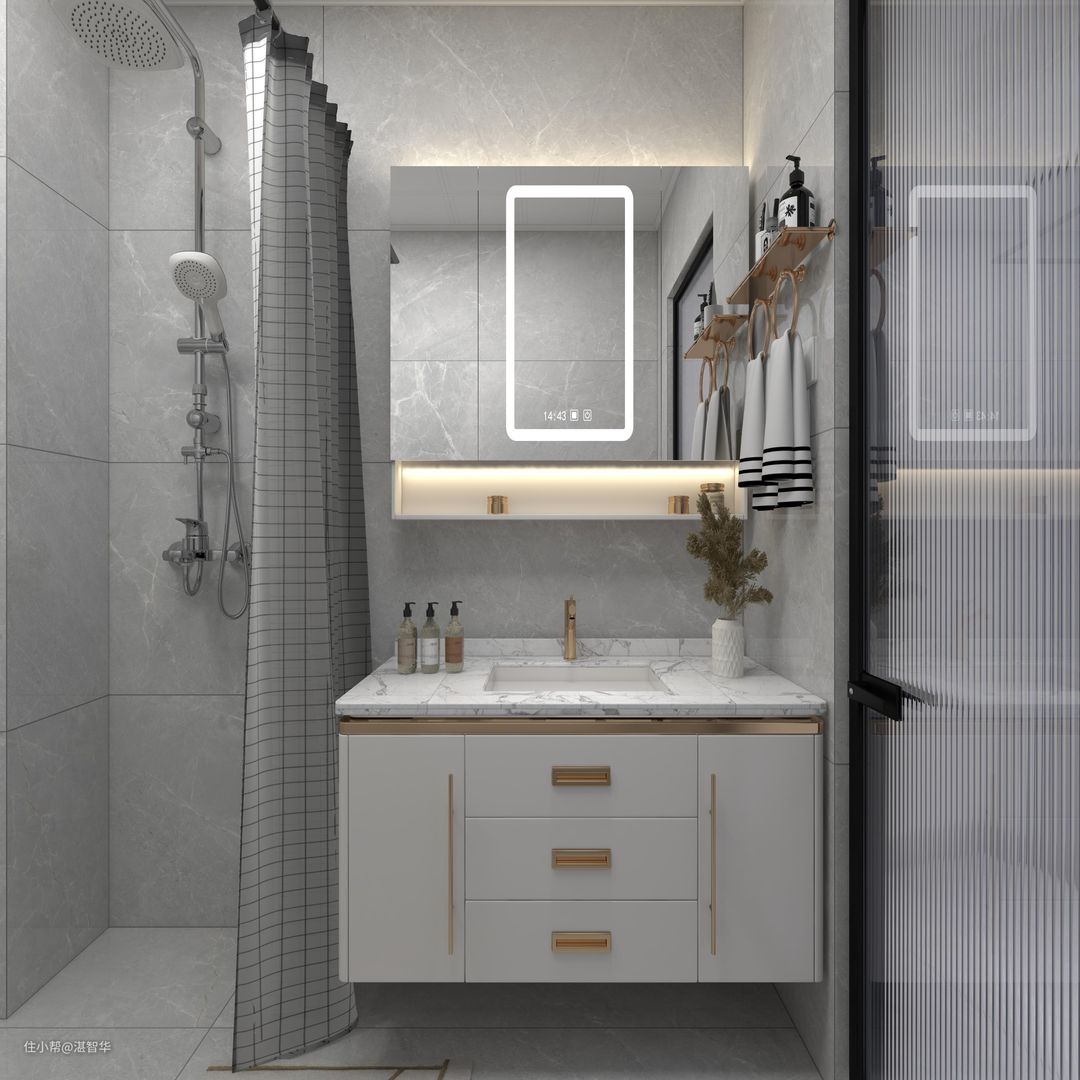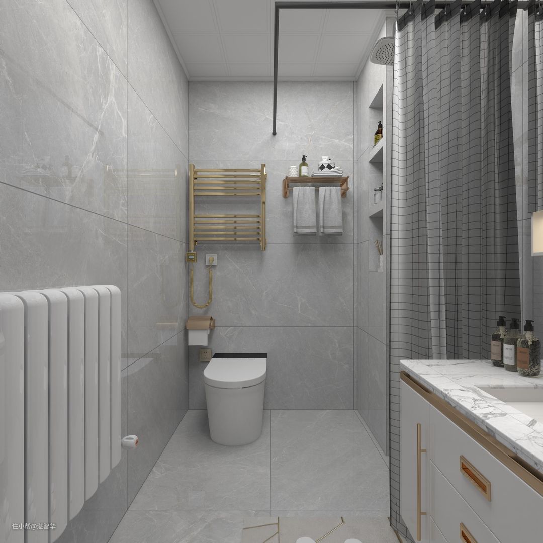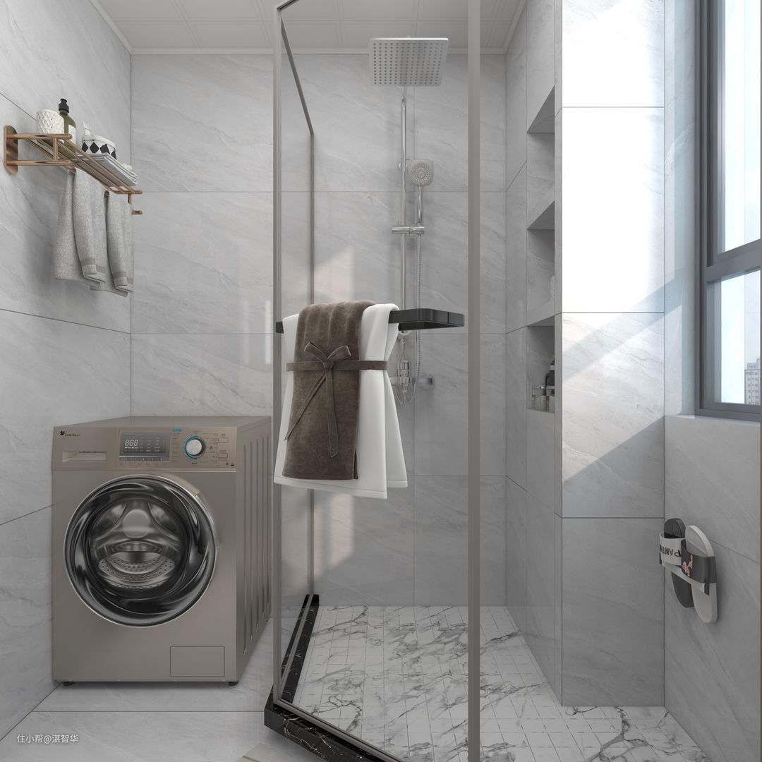 主卫灰色墙地砖耐脏百搭。淋浴区不大利用管道包起来的空间做壁龛收纳一流。拉帘虽不是长久之计但过一两年换一次也不贵。加装的简易晾衣管预防后期不够地方晾晒。