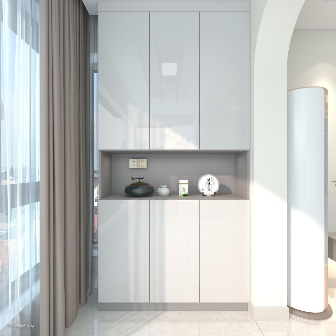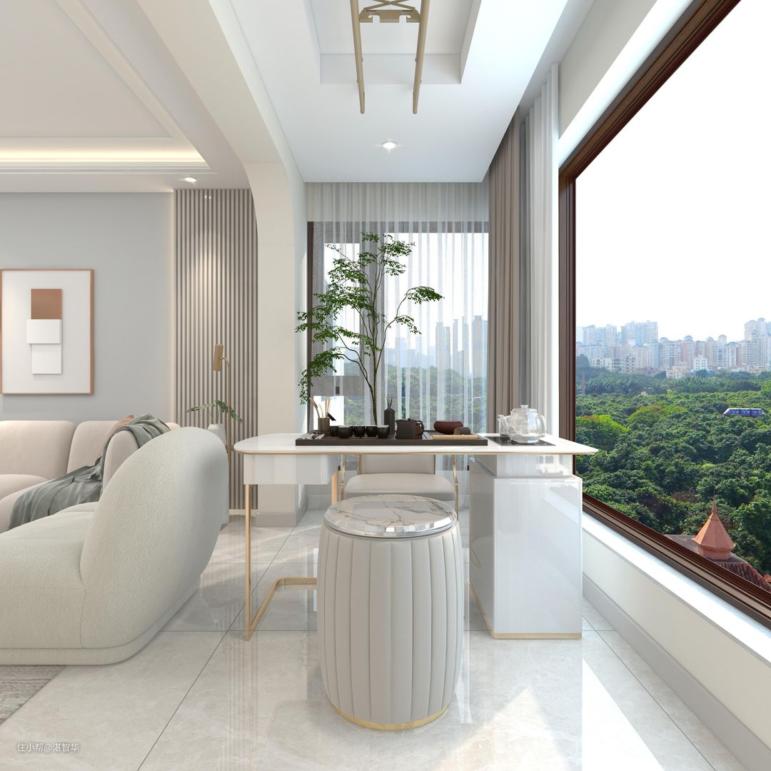 客厅与阳台之间垭口套不包,两侧做圆弧角造型,突显风格特点。窗帘放在大阳台显得客厅更宽敞。一侧做收纳储物柜,另一侧放置茶台,作为休闲区!棚顶做智能晾衣架,操作便捷。如果不安装晾衣架也可考虑洗烘一体机。