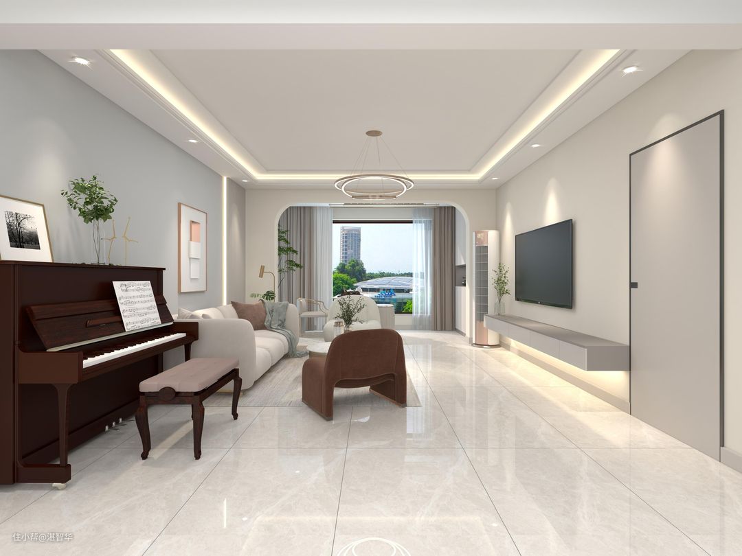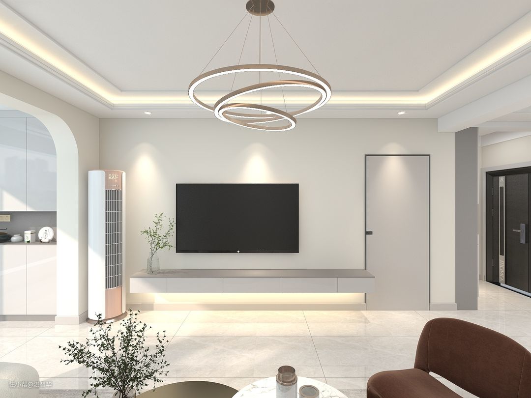 整体墙面颜色以淡奶油色乳胶漆,沙发背景搭配奶咖色。搭配柔和的曲线设计元素,营造出温柔又治愈的家庭氛围。