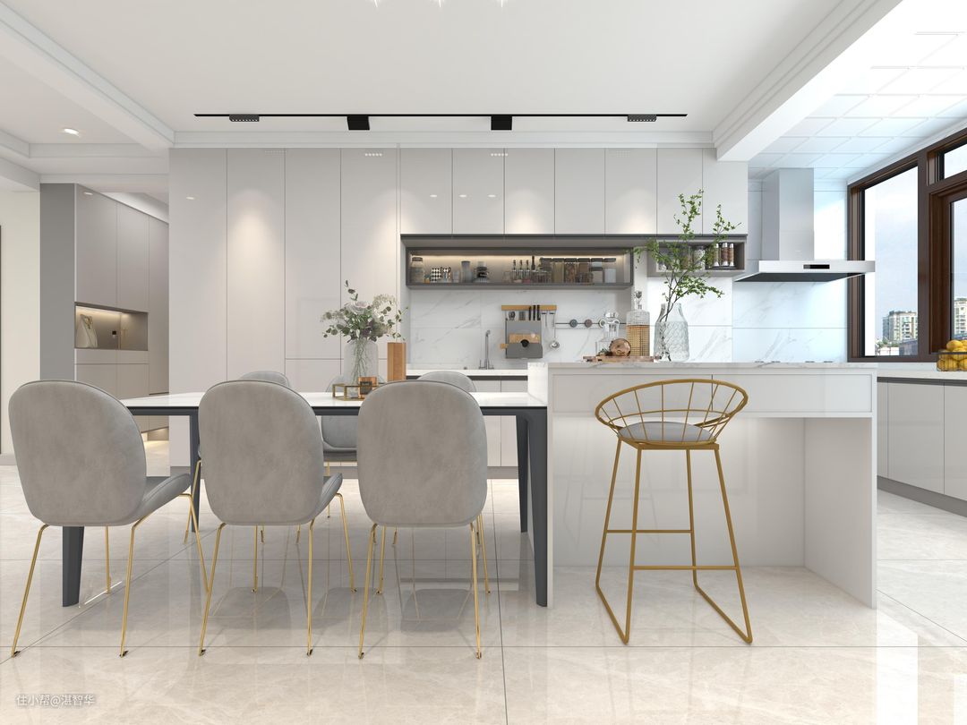 餐厅空间,分水器移动位置柜子把分水器包起来,下层做活动层板方便储不同高度杂物,一组高柜满足平时出门挂衣服区域!挨着开放式厨房,吊柜与高柜厚度一样,平时收纳更多一些,做一组薄玻璃门调料柜,瓶瓶罐罐收纳起来更整洁,烟道和燃气管都包起来!厨房烟机放阳台,阳台窗下做一排柜子收纳小电器类,燃气热水器挂窗附近!如果燃气考虑管道太远可以放水槽上方吊柜里面。