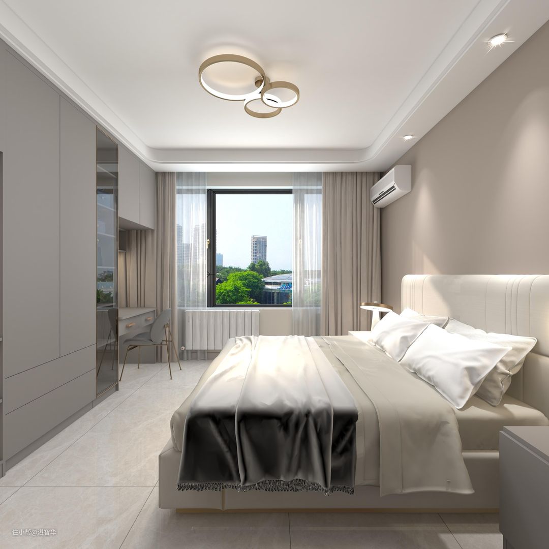 主卧室进门整排大衣柜,床尾做一组储物收纳衣柜,一组玻璃柜放置护肤品或者包之类,侧面柜子圆弧层架,进卧室看着更宽敞!