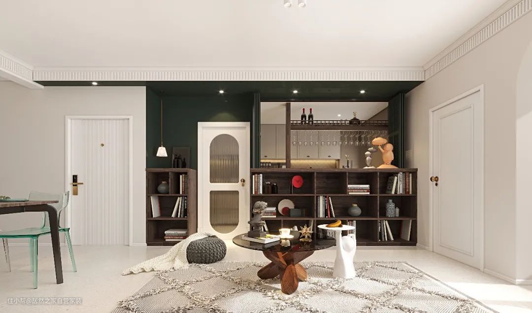 将心所属之爱纳入家中,天花板是简约平钉手法,白色乳胶漆墙面搭配墨绿复古色调的收纳角,塑造空间整体氛围。保留原窗型下方以木工施作收纳书柜,让客厅与厨房空间联动起来,既有一种复古的经典感,又不缺时尚的美感。