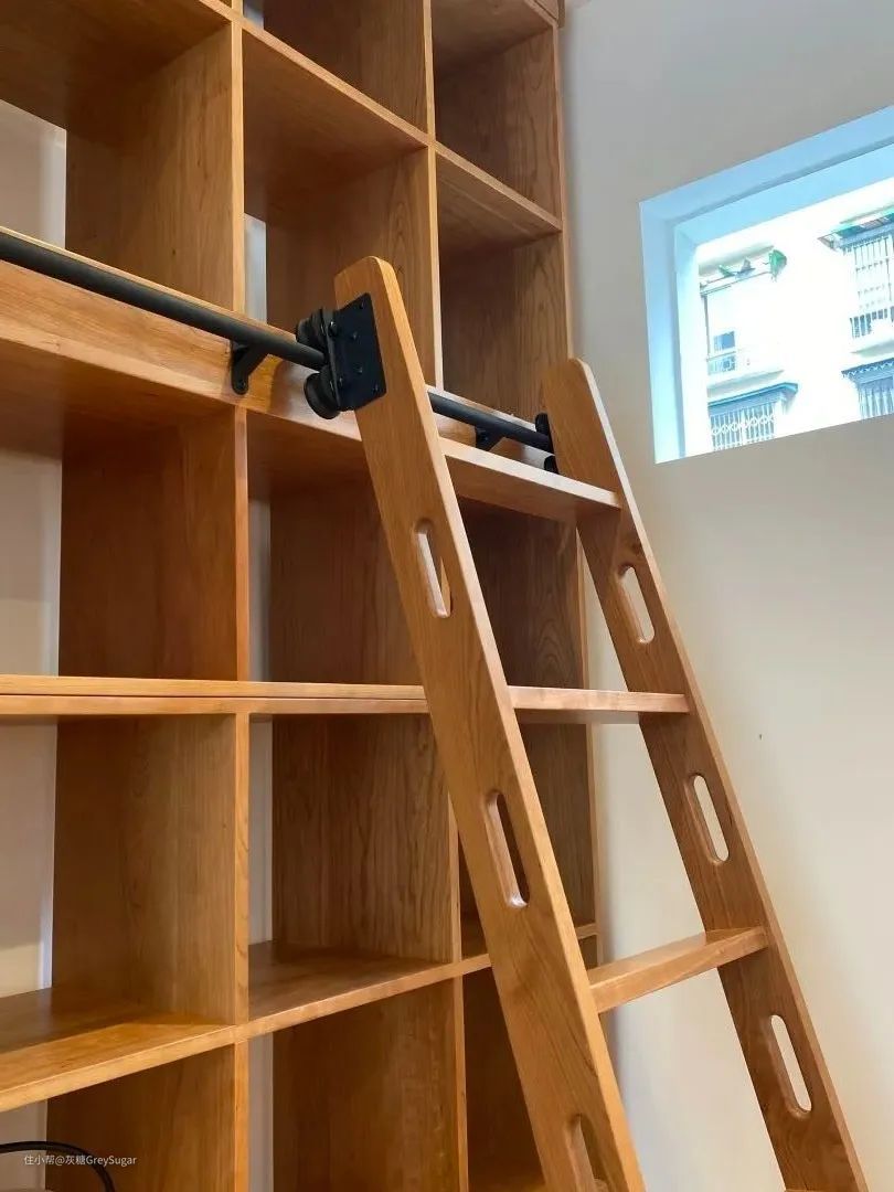 做一个滑轨步梯,根据家中空间和满柜的具体大小再进行角度的调整。不仅实用,占地空间也小。
