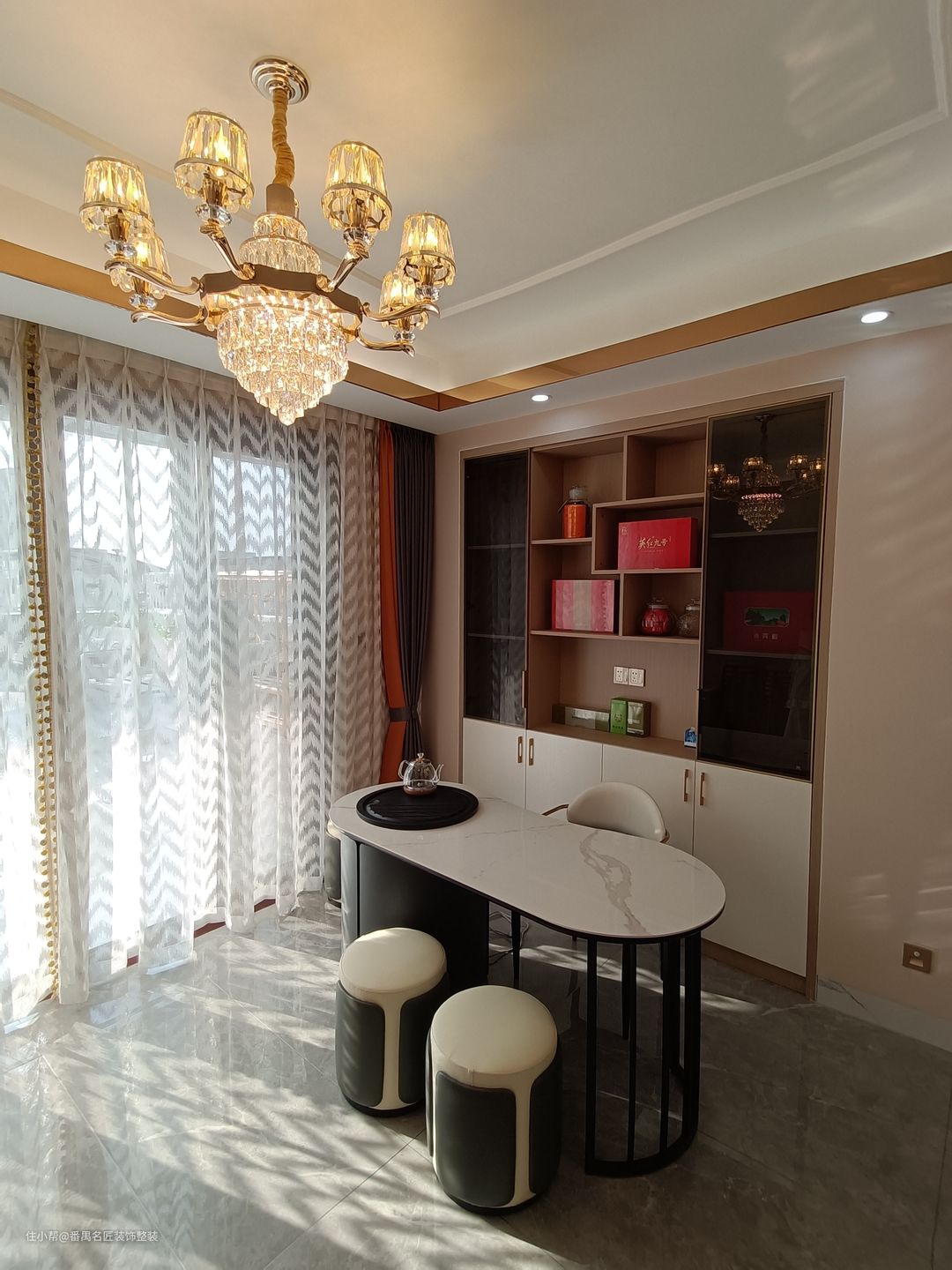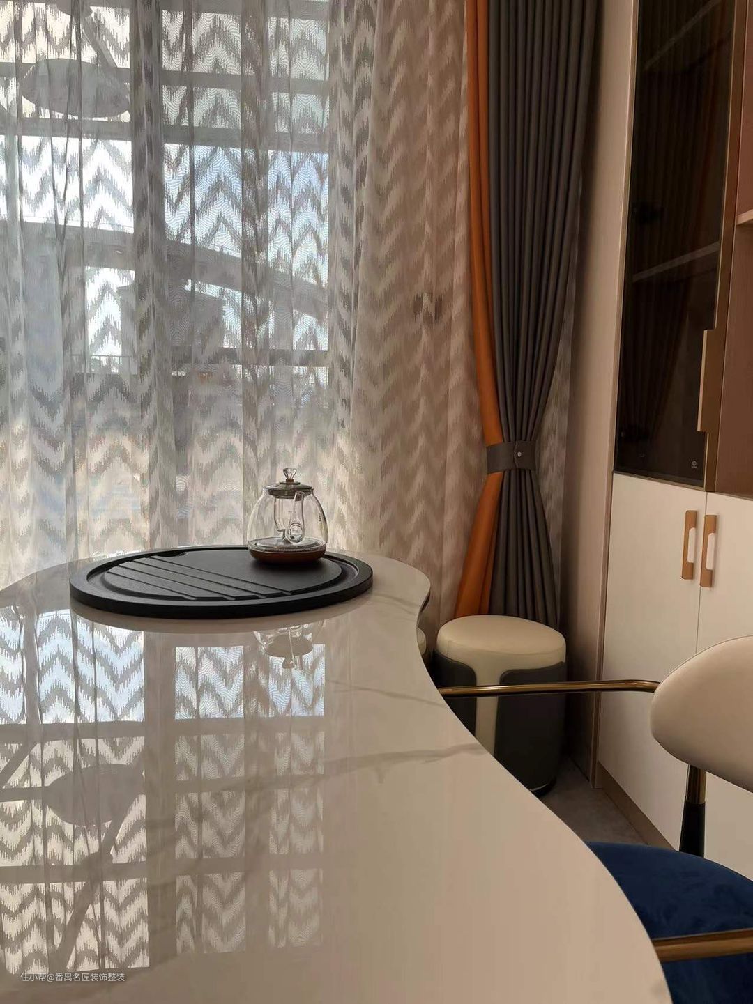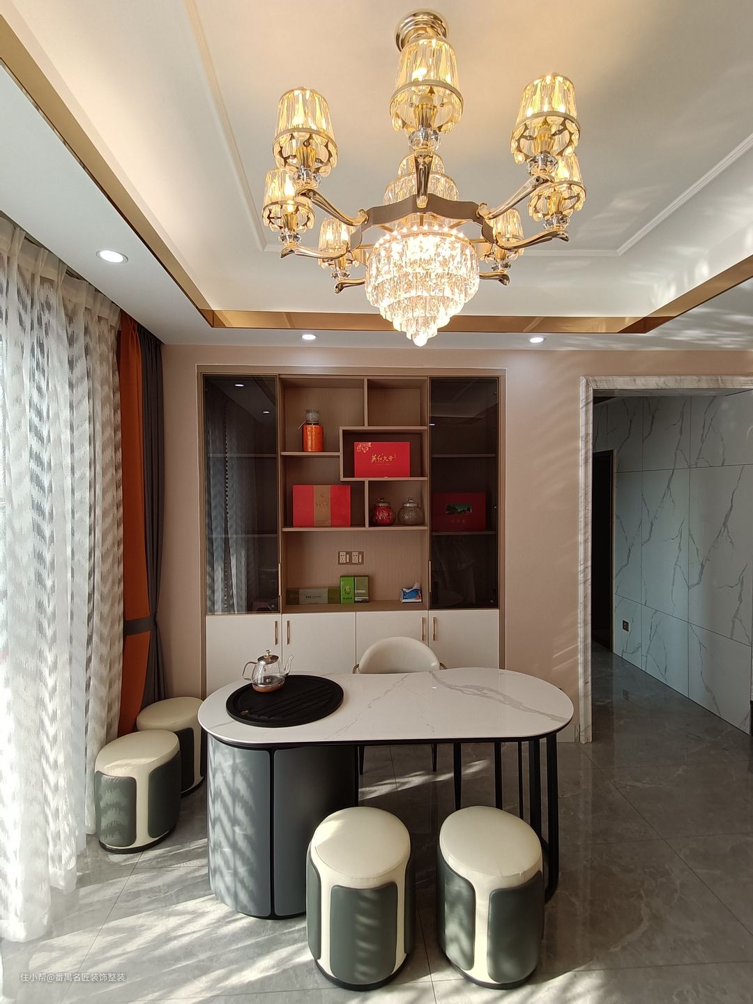 茶室设计在了靠近阳台的地方,整体的光线是比较的好,用白色的纱帘过滤掉强烈的阳光后,照射进室内的光线就比较的柔和了。三五好友,坐在茶室内,喝喝茶,晒着柔和的日光浴,聊聊天,好不自在悠闲。