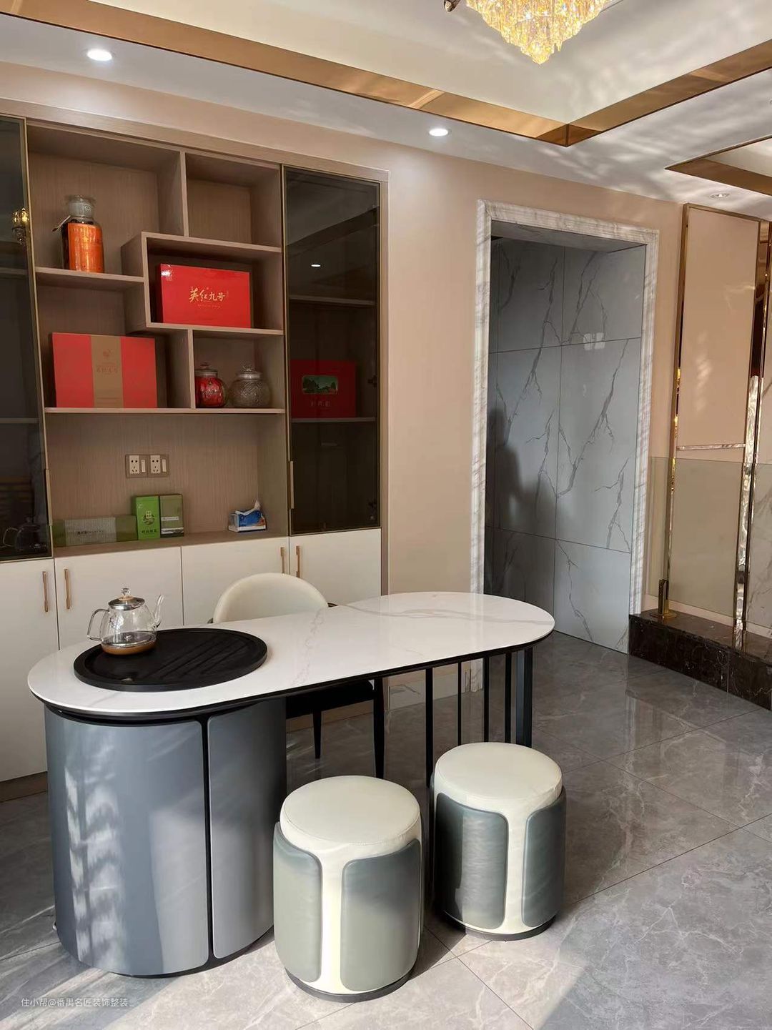 茶桌的后方内嵌了收纳柜,平时常喝的茶叶和茶具可以摆放在展区,方便拿取。不经常喝的茶叶和茶具可以收纳在下方的柜子中,保持室内的干净整洁。