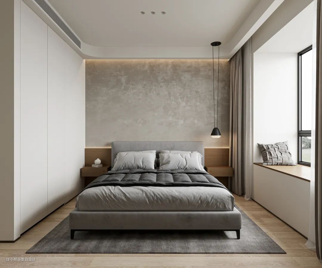 卧室以简单的材质与原木简白色调营造出温馨而舒适的睡眠环境,简练的线条与柔软的布艺,让治愈的感觉随时都在。灰色的床头背景墙搭配灯带柔和的暖光,盎然的诗意在悄然间流转。