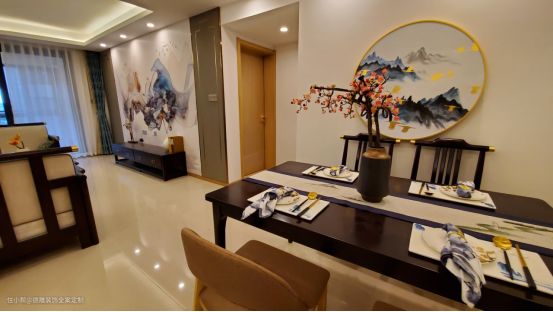 餐桌上摆放着中国最具有古风的梅花,精致而古朴的陶瓷花瓶也是非常具有中式特色,餐厅右侧悬挂着一幅圆形金属边框的水墨云海画。